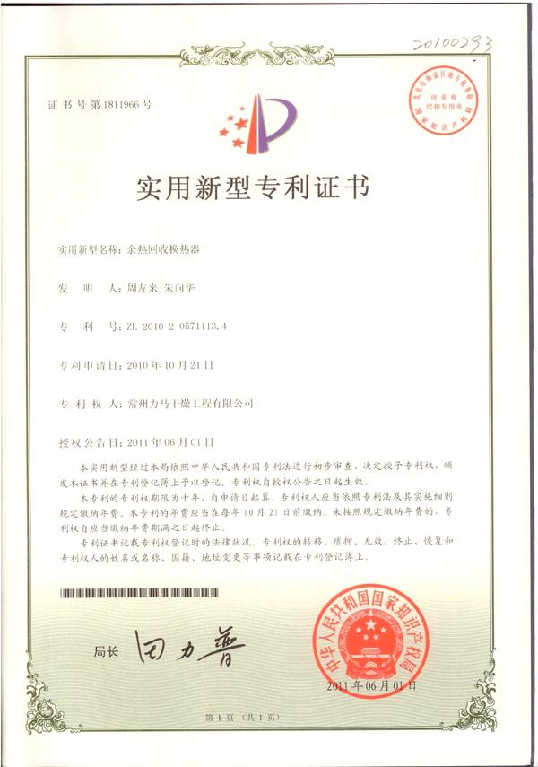 余熱回收換熱器專利證書